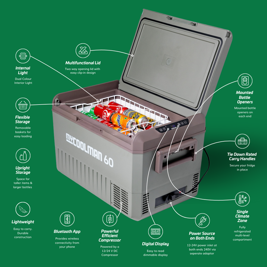 Spacious and versatile, the myCOOLMAN 60L Single Zone Portable Fridge/Freezer is your go-to companion for extended adventures, whether you’re out exploring, setting up camp or hosting a backyard BBQ with friends.